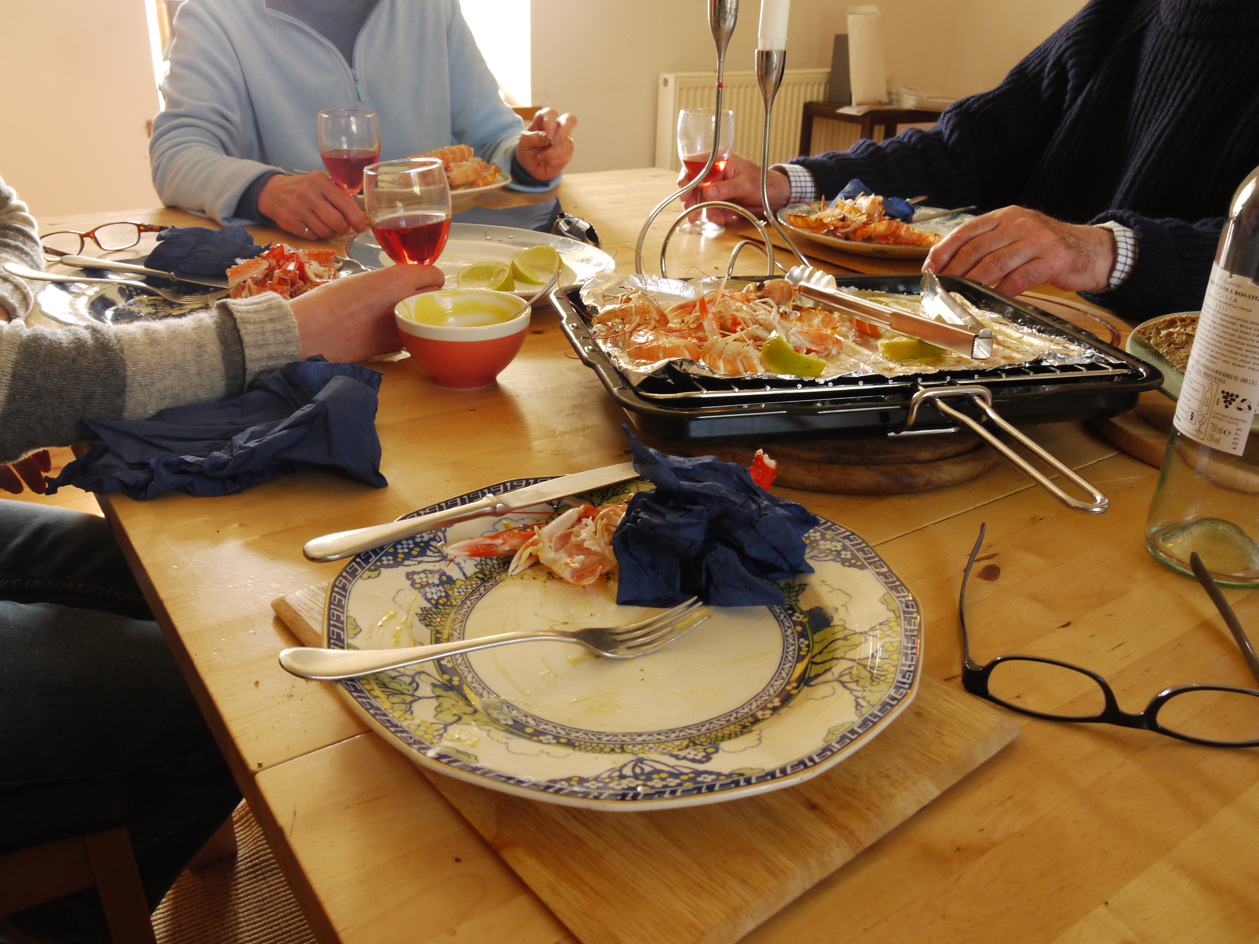 Had Laurie over with his wife Jennie from our ‘Escape’ holiday cottage, Laurie helped start the repair to the Wayfarer, we finished with a dinner of langoustines, crab salad on crostini and a Rose wine.
