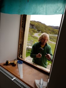 This morning Ian the joiner joined the team. He came unsuspecting to Rona for the week-end. But Nicky his partner had him coerced into fitting our new window for the front of Rona Lodge. At last we have a clear view, more pictures tomorrow.