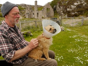 Then it was onto scraping the bottom of MV Rona. When I took Kevin and Hatty to the Vet in Portree on Sunday the boat would barely get up on the plane, so I guessed it was time to clean the hull. Kevin offered as recompense for my time on Sunday night, I could not refuse and the barnacles did not let us down. We spent the day at it and had it cleaned and half painted with anti fouling (we ran out) by 4 o’clock. I took K home to his cottage Seascape and spent some time with Hatty. She had been in the sea to-day so was a bit ‘itchy’.