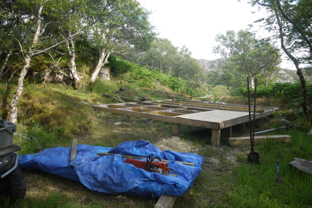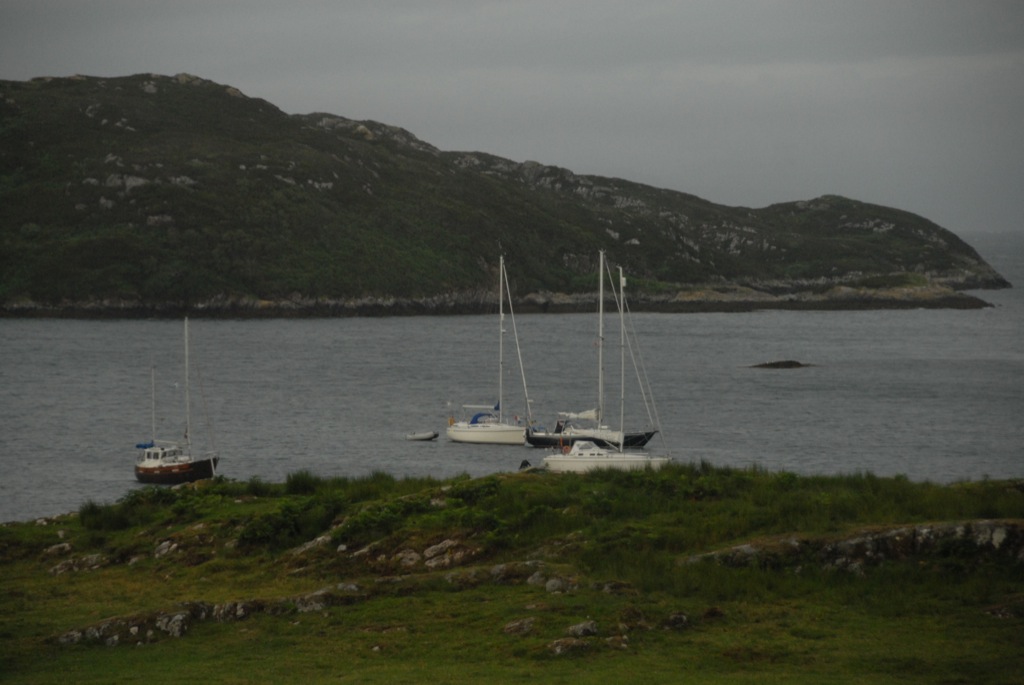 Friday 6th, again what a difference a day makes. We woke to glorious sunshine with the odd wisp of fog. Very warm again and a bay full of yachts, 7 in all, lots of coming and going as stranded yachts made off. With the week running away from us it was head down and deciding what to do with our images web site, our blog and the Rona web site. I’ve decided to close the images one as the technology was ancient (Windows Frontpage bought for over £240.00, 6 or 7 years ago, now obsolete!!). We’ll have more of my images on the photo page once I get the blog up to date and Dave advises changing the name of the blog, we’ll see!! It was a hectic morning with visitors again then we decided to escape up to the summer cabin we are putting in the woods. It is a day cabin where we can get away from the house for a while and has been a few years in the planning. It is quite simple and basically a garden shed, but the view is stunning.