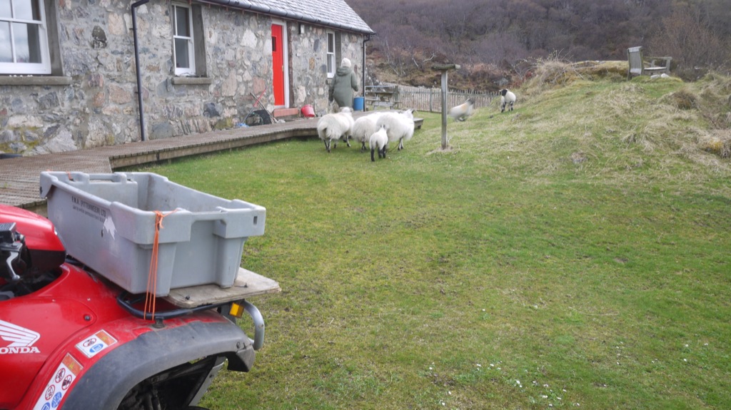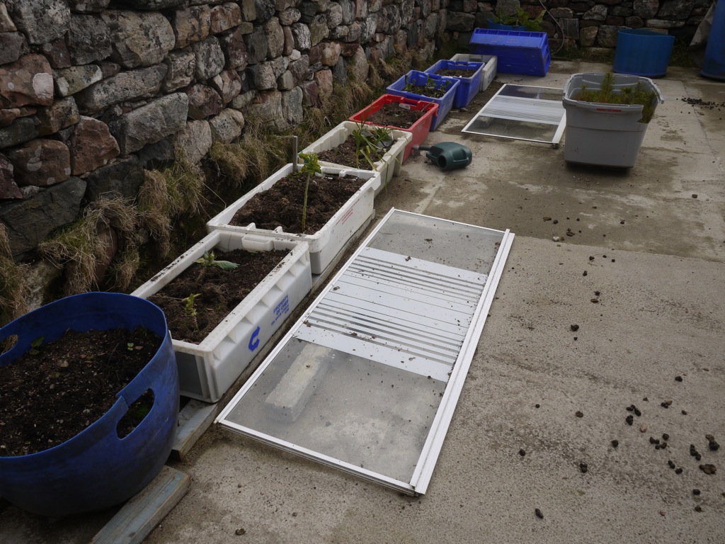 The polytunnel was quite dry so the sun must have been shining, the growth though is very slow as a cold wind still persists. The sheep had escaped to Dry Harbour in search of grass and with visitors coming on Saturday we needed to get them home.