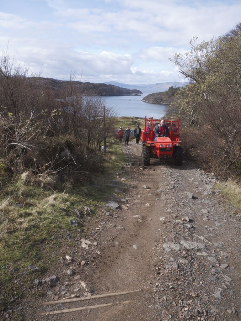 We had identified a new path access past Rona Lodge through the trees to the East of the house so Wednesday was spent cutting a way through, we had not cut enough firewood so it was a good way to do it. When the digger comes he can level off the access and give the visitors another option. Again it was very windy but a good working day, it calmed later and Wednesday evening was very fine even frosty through the night. The rest of the day was taken up organising the landing craft from Mallaig, once I’d called my JCB mechanic in Raasay (Hugh) to find out why our JCB would not start, he put his finger on it right away and once the loose wire was reconnected all was fine. I needed a load of gravel for the new path and the JCB up top to load the firewood for tomorrow.