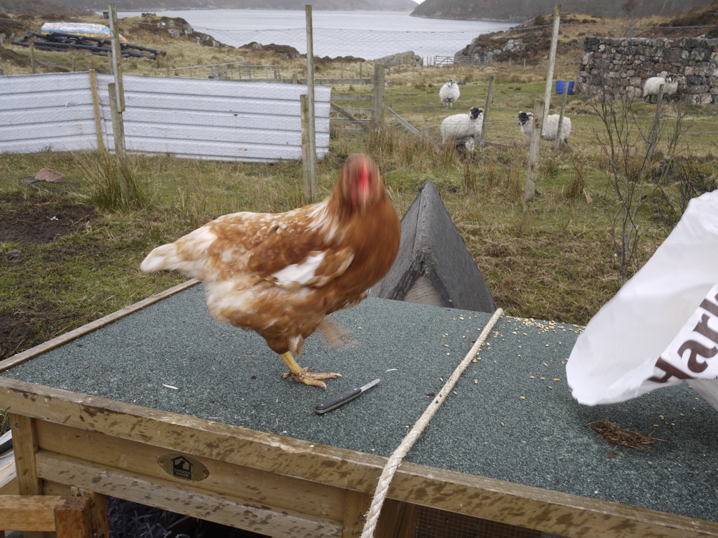 This is the bay where the Whisky smugglers used to operate (So I’ve been reliably told!). We have never managed to find the still ‘yet’. Once back at Big Harbour L suggested clipping the hens wings since they were ok to let out of the pen. So without further ado I caught them up and clipped one wing (a bit better than the very first time I did it, many , many years ago when I clipped both wings, Doh!!).