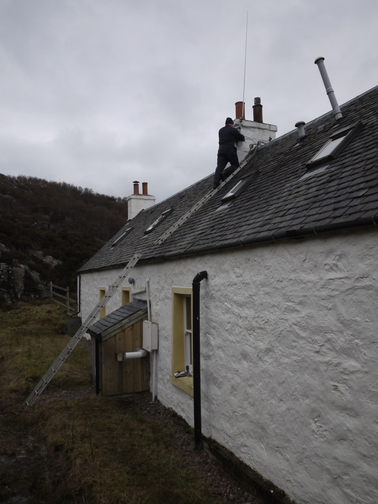 Sunday morning was not much better but at least it was dry. The VHF was removed from the kitchen last year and never put back. It is very handy and it was corrosion that had stopped me re-installing. But I had, had it repaired and with my sparky here we set about putting in new cables and running it into a new location. Calum was keen to get on the ladder onto the roof so I shouted instructions to him, which he ignored anyway.
