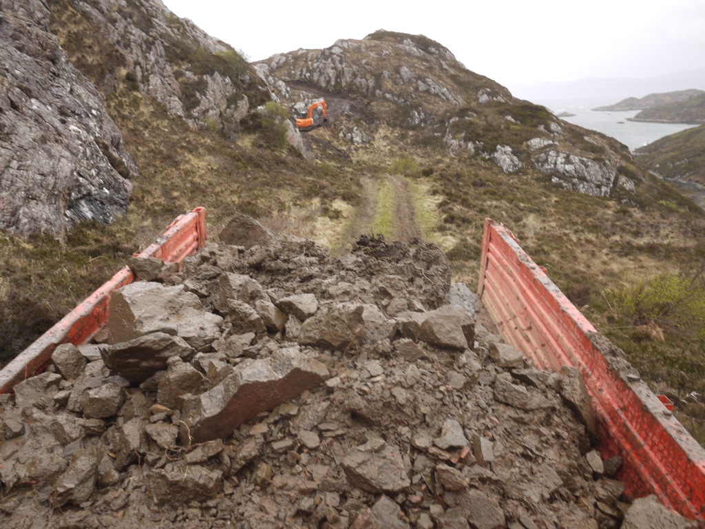MV Spindrift was still in the boatyard so MV Stardust did the trip, yacht Rona 2 was on the mooring having been sailing around the area but was heading over to Shieldaig later. On Friday the weather was breezy but very wet which did not help our road building but it had been a dry winter so a lot of the rain was running off rather than soaking into the ground. In fact where Hugh was digging was very dry under the first couple of inches. Later on Friday night, Calum arrived, Irene was away for the weekend and the sea was calm enough so he headed out to give us a hand on Saturday.