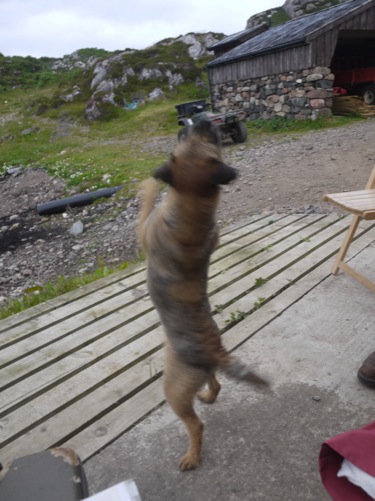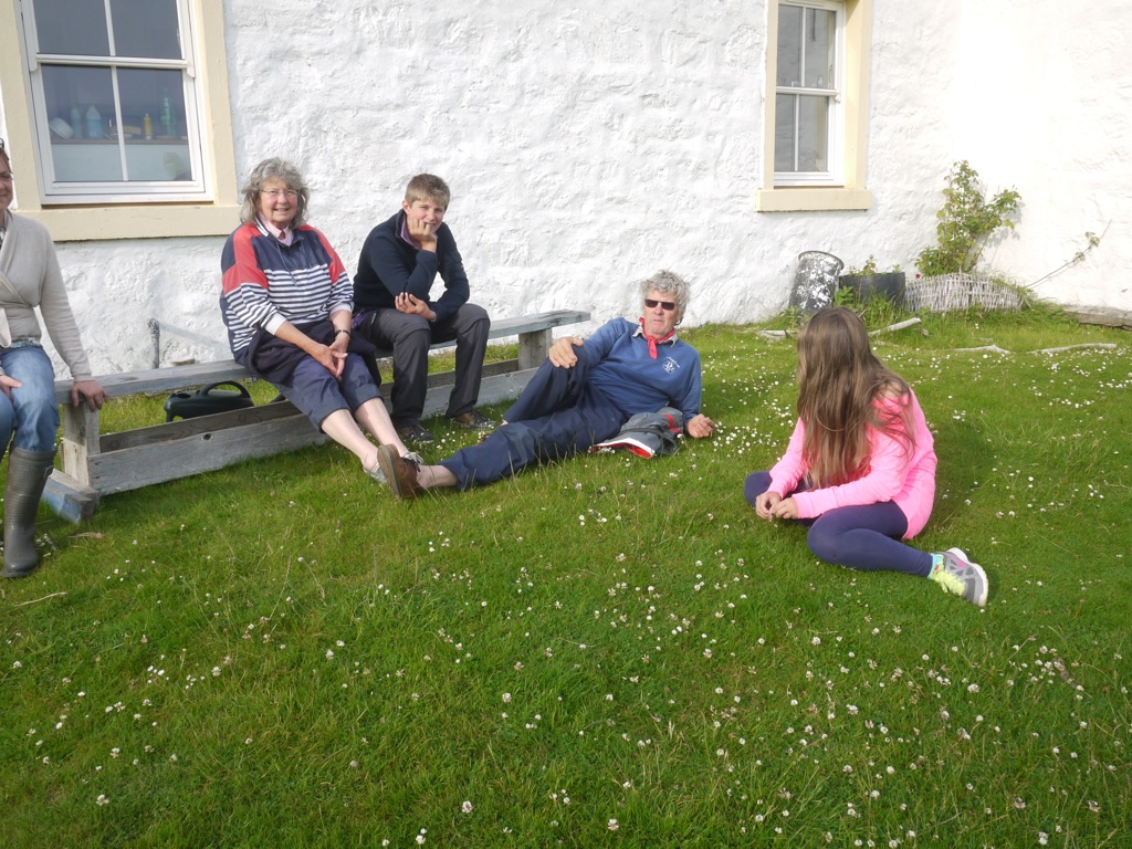 John had been over to Rona in the seventies with the Applecross Outward Bound group. So he was keen to see what had happened since then and having grown up in the same village I did he was keen to swap news. Arriving on a sunny night with Dolphins making a show was a good start but since then the weather has taken a dip, but it will return I’m told. Sam and Sue came up just after we returned from the cottages and in the middle of making Tea, nothing for it but a couple of generous gins but it was late before we sat down to fish and chips, 10pm!! Then even later Calum arrived on MV Kestrel for a weekend celebration, with Eileidh Ann and Alasdair (and the dog Seorus). So nothing for it but to have a whisky with them in the bothy. Calum had taken up his accordion after years of sitting in the corner so we were looking forward to getting a tune.