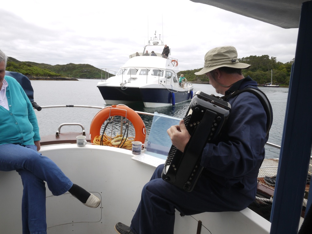 Saturday 13th: Now retired he tried a bit of busking on the pontoon in the morning but the ‘yachties’ didn’t reciprocate and his hat was pretty empty. Later in the morning MV Seaflower arrived back for a second visit, this time with the Lochcarron Music Group. Calum played them ashore.