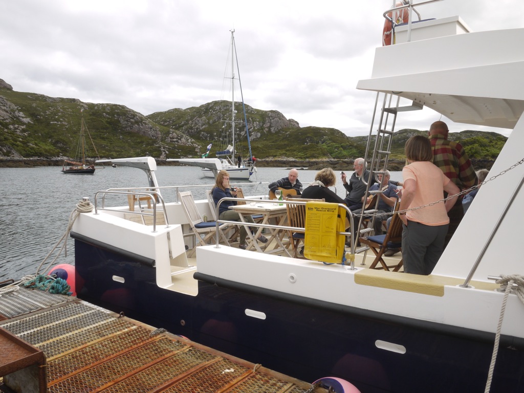 Calum played until 9pm even suffering the midgies for a spot of al fresco playing, much appreciated by the 14 yachts in the harbour. We had a flotilla on an Islands Whisky tour.