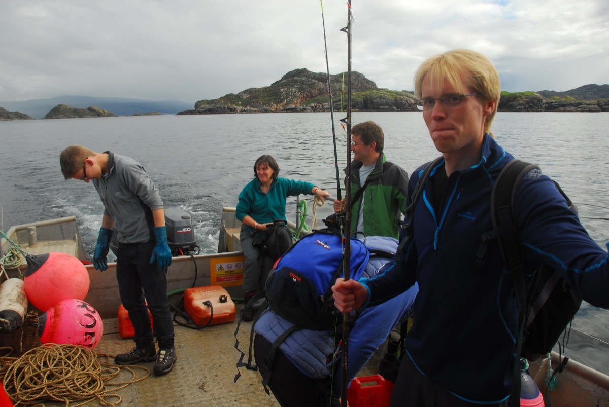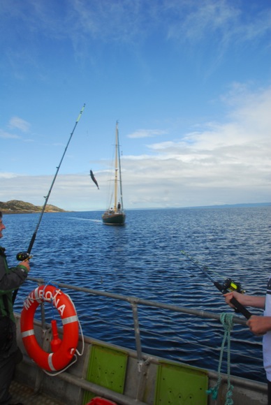 Next day the cottage folk had booked a boat trip. The weather broke, settled down and we headed down to Kyle Rona for some fishing. We saw stags on the shore, an elusive otter and caught some fish but the sea remains very quiet with not a lot of fins or seabirds to be seen. Yacht Aquilla, came alongside, Ranald Coyne a Rona visitor of old had a chat and headed into Big Harbour looking for showers.
