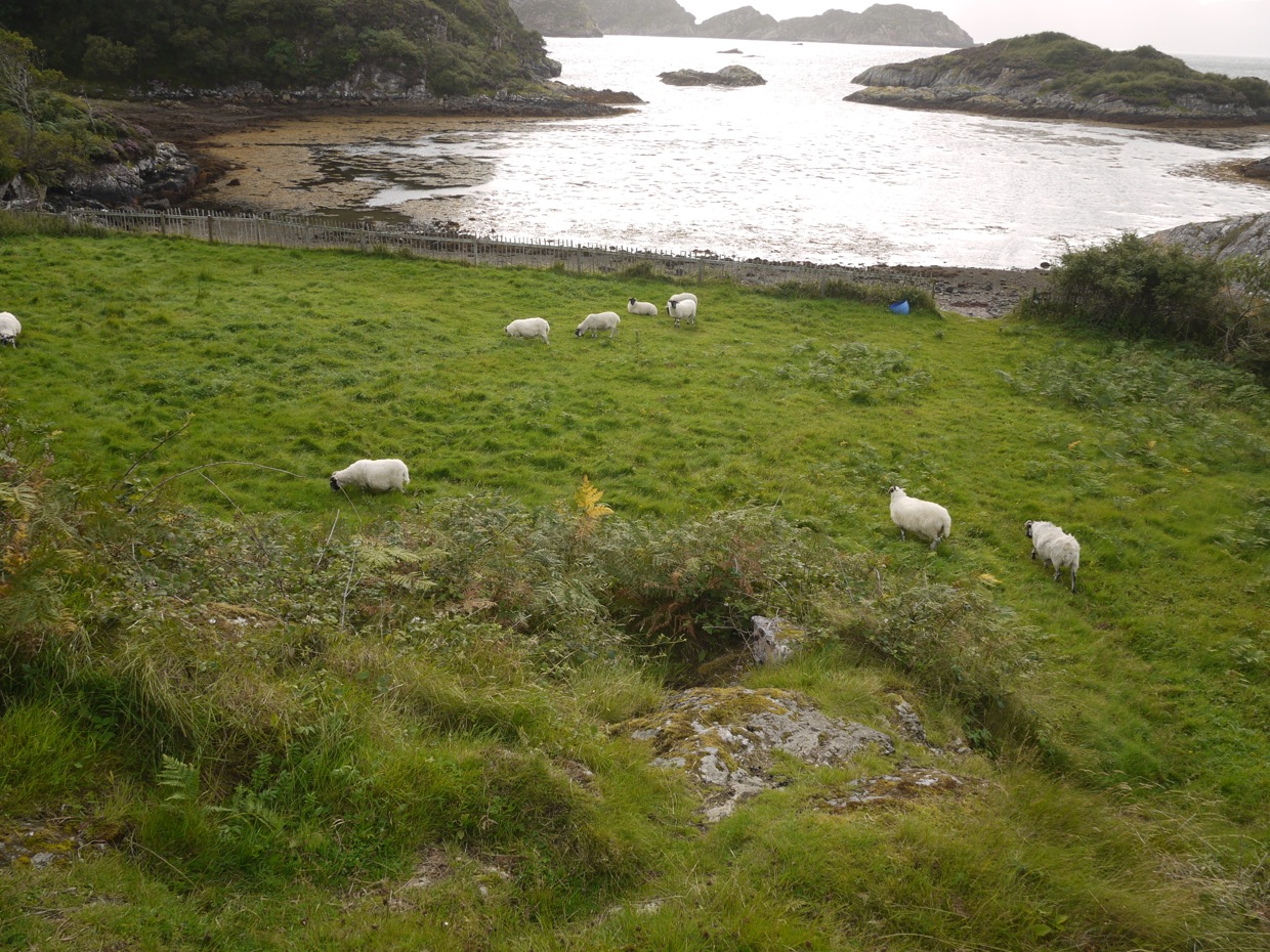 Lorraine was at Dry Harbour working in Escape getting it ready for a photo session as we are putting it on Alasdair Sawday’s web site, we feel like a change. She reported the Ewes heading over to Dry Harbour which was no surprise as the wind and rain had seen them sheltering behind the Lodge generally turning into a ploughed field. I went over later in the day and there they were mowing the Old School’s playing field.