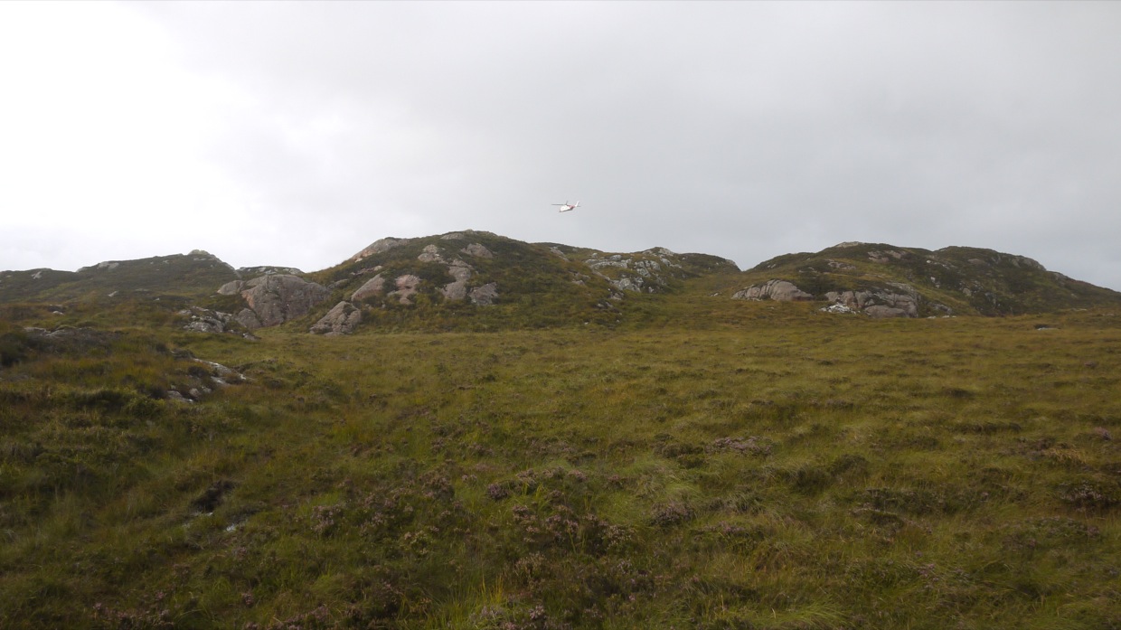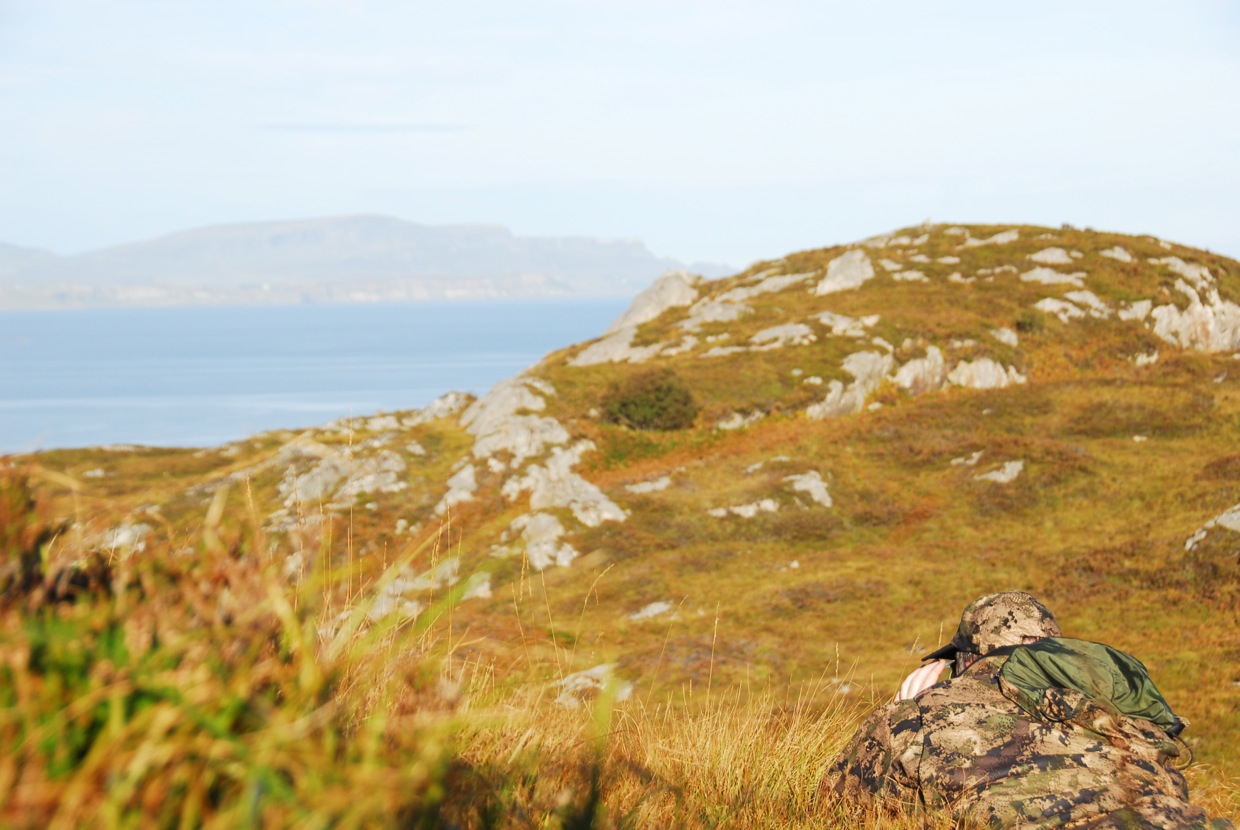 Next morning it was back out and onto the high hill just South East of Dry Harbour. We were just lying there taking it all in when the Qinetic helicopter taking the staff up at 8.30am passed just over our heads, the deer we were watching never bothered even to look as it passed close to them on the hill further North.