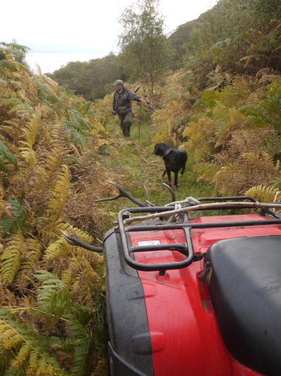 All too soon it was Thursday, Kevin and Pam were coming and the rain arrived too. That made for a difficult start but we got there and had rigged up a platform after last years experience loading deer. Wallace kindly took the carcases of two of our cull deer to the Dingwall Game Dealer, Fyne Game and left around lunch time. On the ferry coming were old friends, Margo and Iain Bennet. Iain was the Head Stalker at Strathviach Estate between Ullapool and Dingwall, some 39,000 acres. Iain born in the middle of Glasgow and starting work as a trained chef would not have imagined ending his career on an estate this size, looking after over 1000 sheep 100+ cattle and culling a lot of deer.