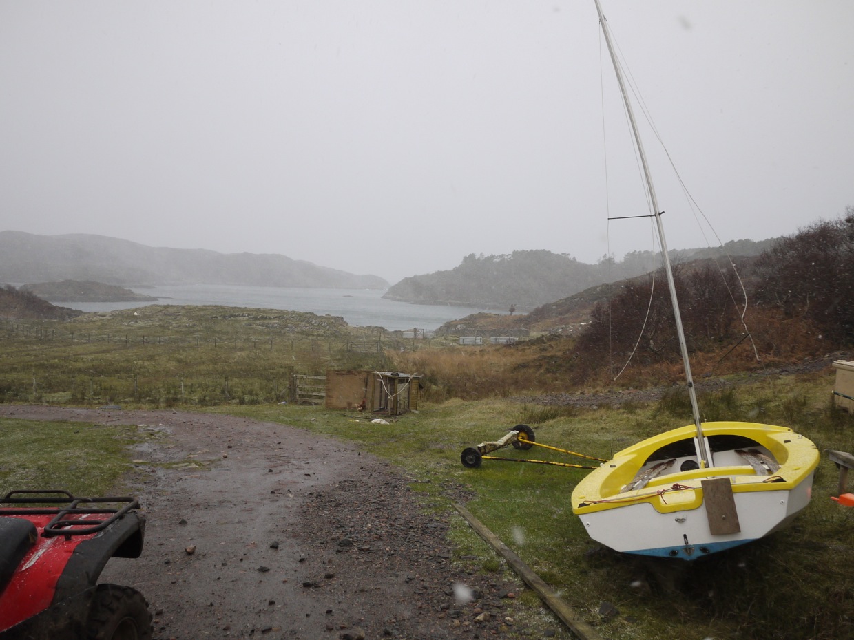 I’m just waiting for the ‘snow’ to stop and then I’ll go down to put it back. The boat ‘MV Rona’ is well up the beach but the rope holding it onto the shed support is bow tight, looks like the tide/sea was a metre higher than normal and trying to drag it back out to sea!!  At Dry Harbour the seaweed was onto the grass in front of the Schoolhouse. The usual plastic boxes and any paper has been blown about, ladders off the roof, chimney hats gone, but I guess we are lucky that there was not any more damage. Now it is snowing really heavy.