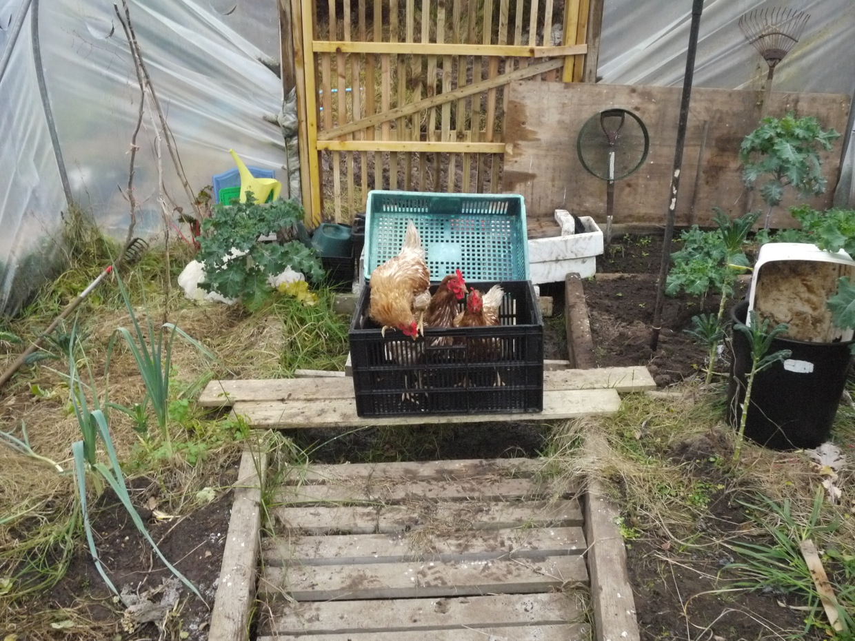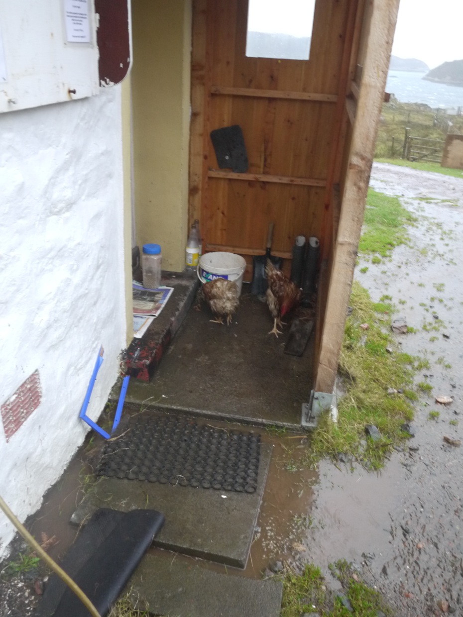 Been a windy and at times very wet weekend, so wet and windy that we had to move the hens on Saturday. Last year the mink got the hens before the bad weather, all four of them in the first week of December, this year we have caught too many mink and we were unprepared for how dismal the hens looked. Because of the mink and rain in Oct’/Nov’ we moved them up to the house. But due to the gales and persistent rain since then, we had to move them a second time to the poly tunnel. It was lucky we had it.