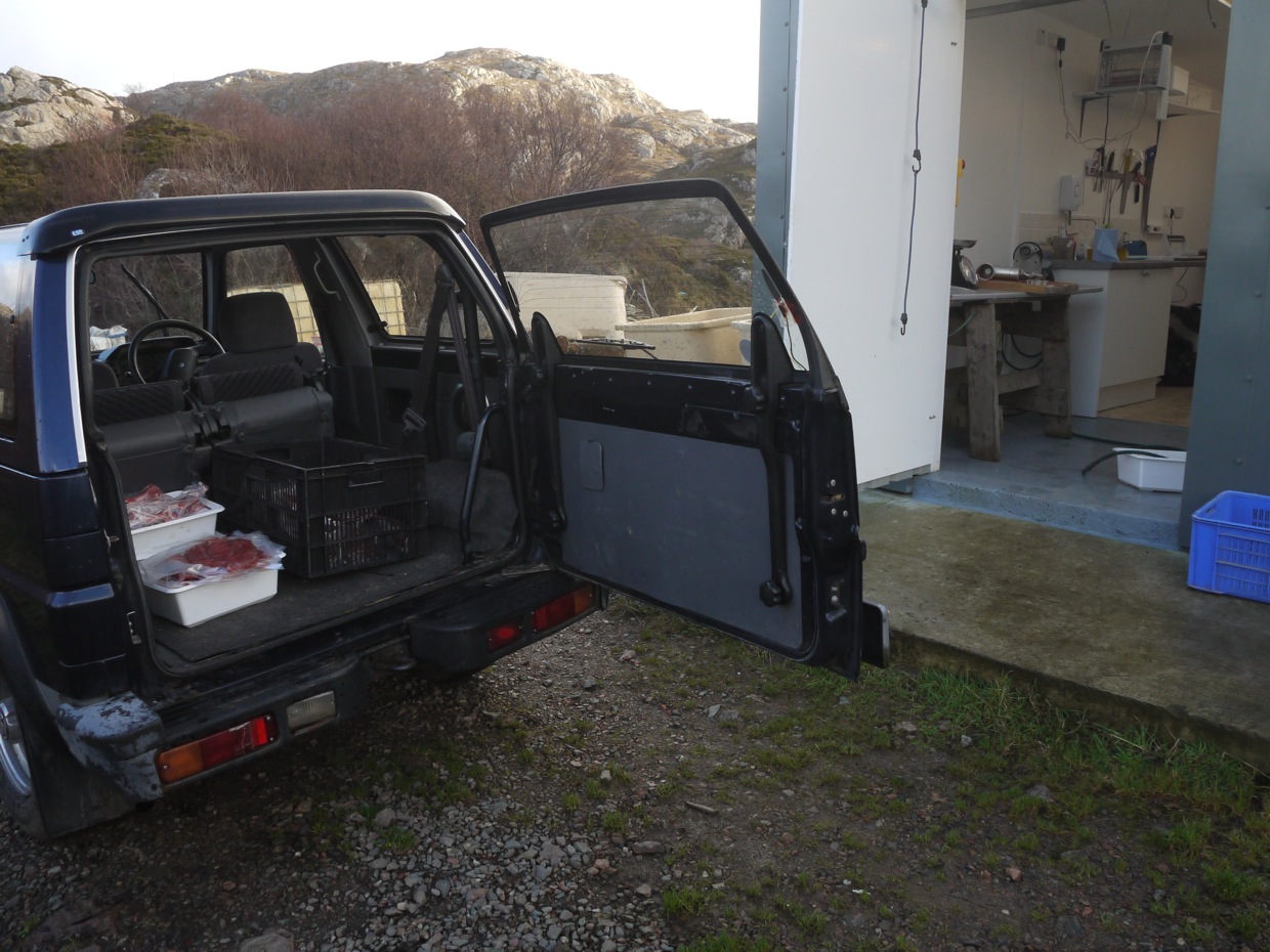 The venison from this hind was the best and plenty of it. We contacted the local vet Rhona to see if she could find a market for the off cuts, so this time I had to be a bit more careful with the cuts and saving the bits I usually feed to the crabs or Sea Eagle. Hopefully the pets will enjoy the bones and bags of minced venison. It was fine and sheltered up at the larder but the rain was always coming down when it was time for lunch or to finish for the night. So it was good to have the jeep to take the trays down to the house for freezing. Broken spring or not.