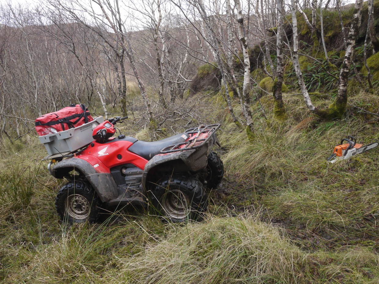 On Wednesday probably the best day of the week I had another wee walk up to the Qinetic Base. With no prospect of a ferry boat before Xmas and a stash of mail plus Xmas presents in Portree, bought on the internet there was no option. Also with the hind butchered and ready to go I was keen to get some venison off the Island. First of all we had loads of mail going off plus the late Xmas cards. So Tuesday was split with sorting venison and doing paperwork of one sort or another. I also knew that the half way point going North was really boggy and would need some clearing to get through a dryer route. Of course the saw started to give trouble but I got it going and cleared a road.