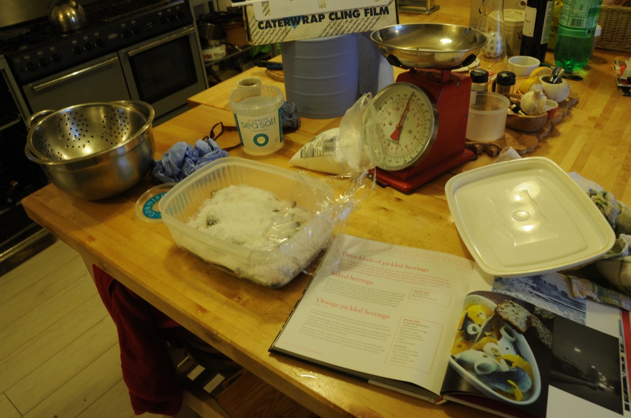 Friday it was not worth going outside, we had filled the freezer with venison so it was time to clear it out. We had some herrings from Kenny and I’m the only one who eats them (fried in oatmeal) so they do not get used much. I had 1 dozen fish so rather than let them waste, we decided to pickle them. I filleted them and put them under salt, for a week. L  likes the Ikea herrings so here’s hoping!! (Yes you can buy fish in Ikea!!) After that we headed over to the cottages, for a bit of painting and finishing off.