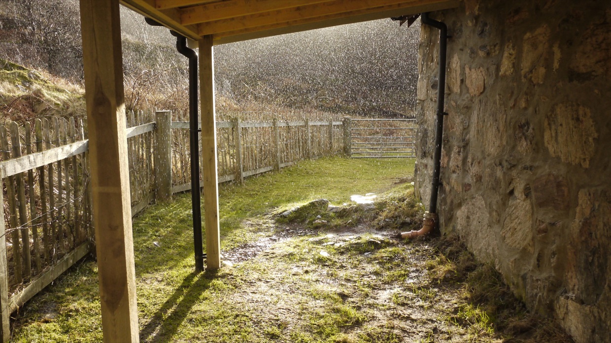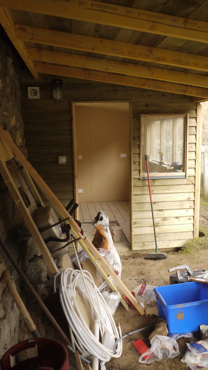 I finished the back and started on the decking but the rain stopped play. I’ll get it sometime. I had lost enthusiasm for the holiday cottages but with the season slowly looming I thought I’d better get going. I loaded up the bike with the tiling gear and headed back to Dry Harbour to set up the new shed out the back for the floor tiles. Sunday I fed the sheep, slipped on the wet grass thought nothing of it and headed over to tile.