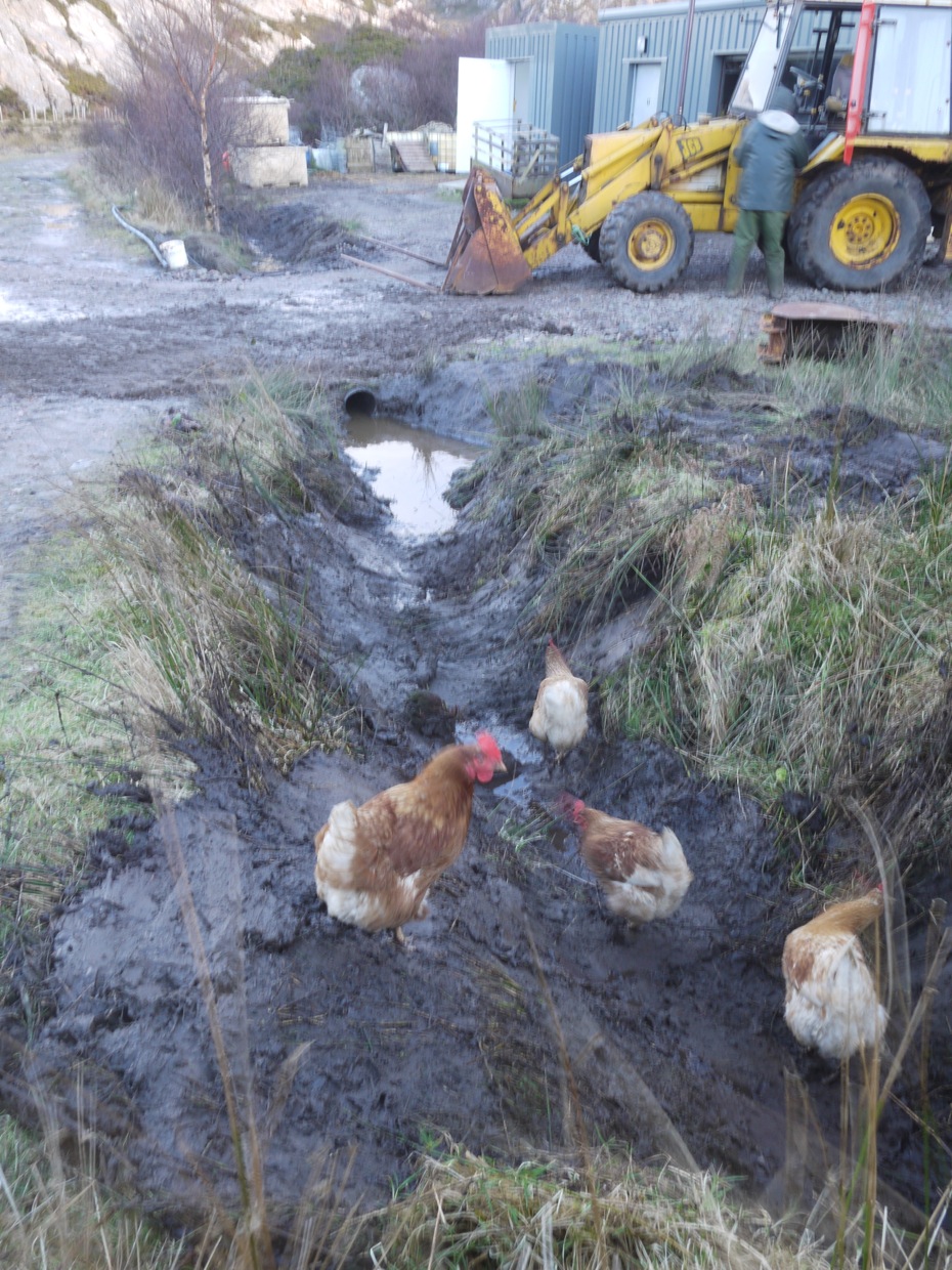 We got it going in the morning after I had jammed an old piece of curtain in the middle of it, trying to push the silt through last night. The hens liked the bugs we were digging up though.