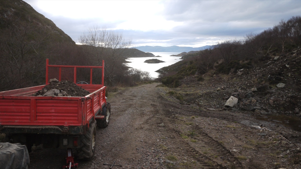 Then it was back to the forest to put in the strainers for the new sheep (Yachtie) fence!! The day (Monday)was wild and showery but in the forest it was sheltered and good to work in. We got all the strainers concreted in, the ground being so hard it is difficult to get depth. In the afternoon George carried on with the road work and I got ready for sheep work on Tuesday.