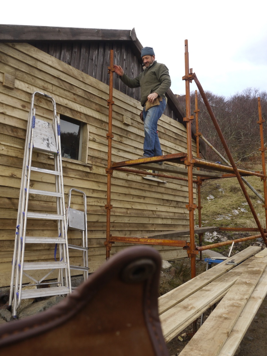 The hens are a bit jumpy but they will settle and they are now shut in every night, the mink are very much still about. Last week Mark spotted one over on the shore at Dry Harbour. Meanwhile back at the Lodge the timber sitting in the shed for 6 months finally made it onto the wall. It almost didn’t though as the health and safety executive were less than impressed at my scaffolding skills!!