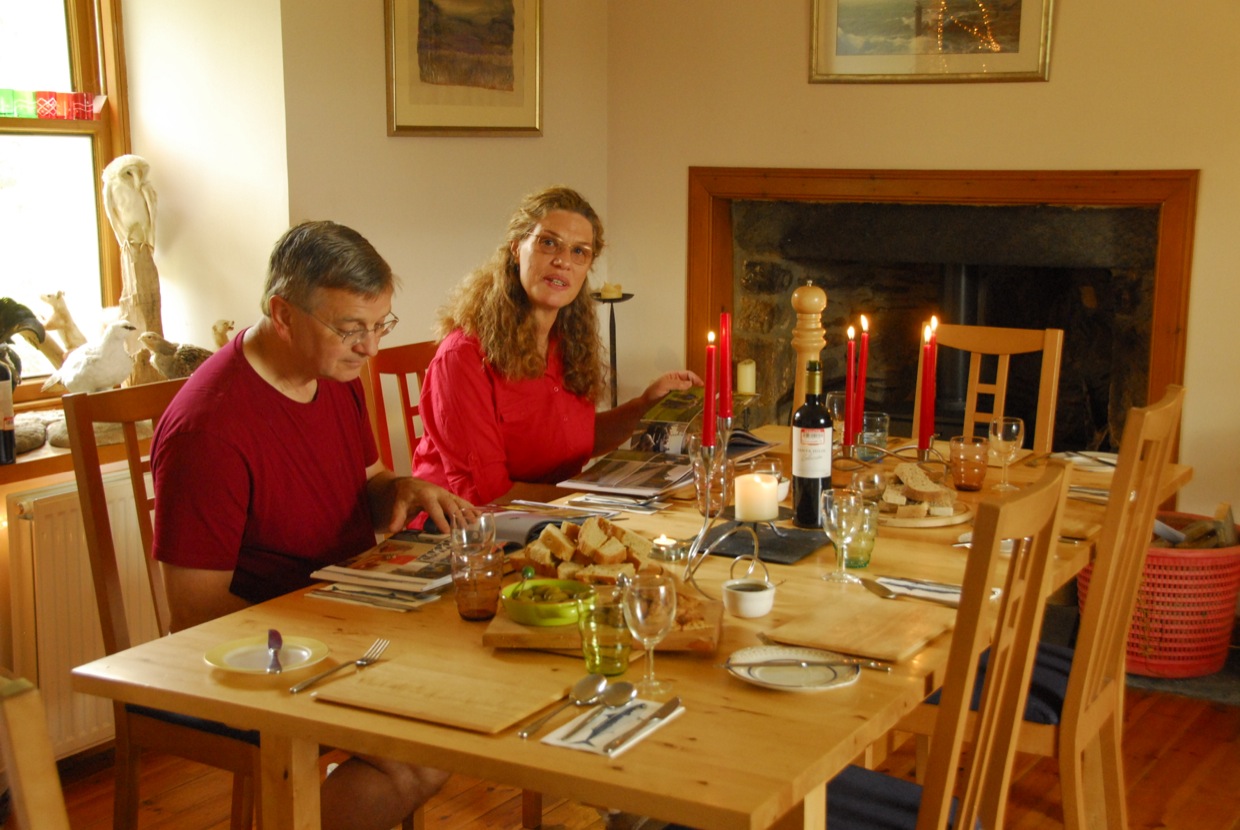 Saturday, we had a request from Stephen and Rob who were kayaking up from Raasay, they were looking for a night in the bunkhouse and ‘maybe’ we might be doing a supper club. Steve and Angela who had arrived on the ferry had been to the cottages last year and had missed last years supper club, so, we offered to cook up something. We are getting organised now so it is a lot easier but it was still a long day. Very enjoyable though with crab cakes, then a Rona bouillabaisse followed by Rona rhubarb and cake.
