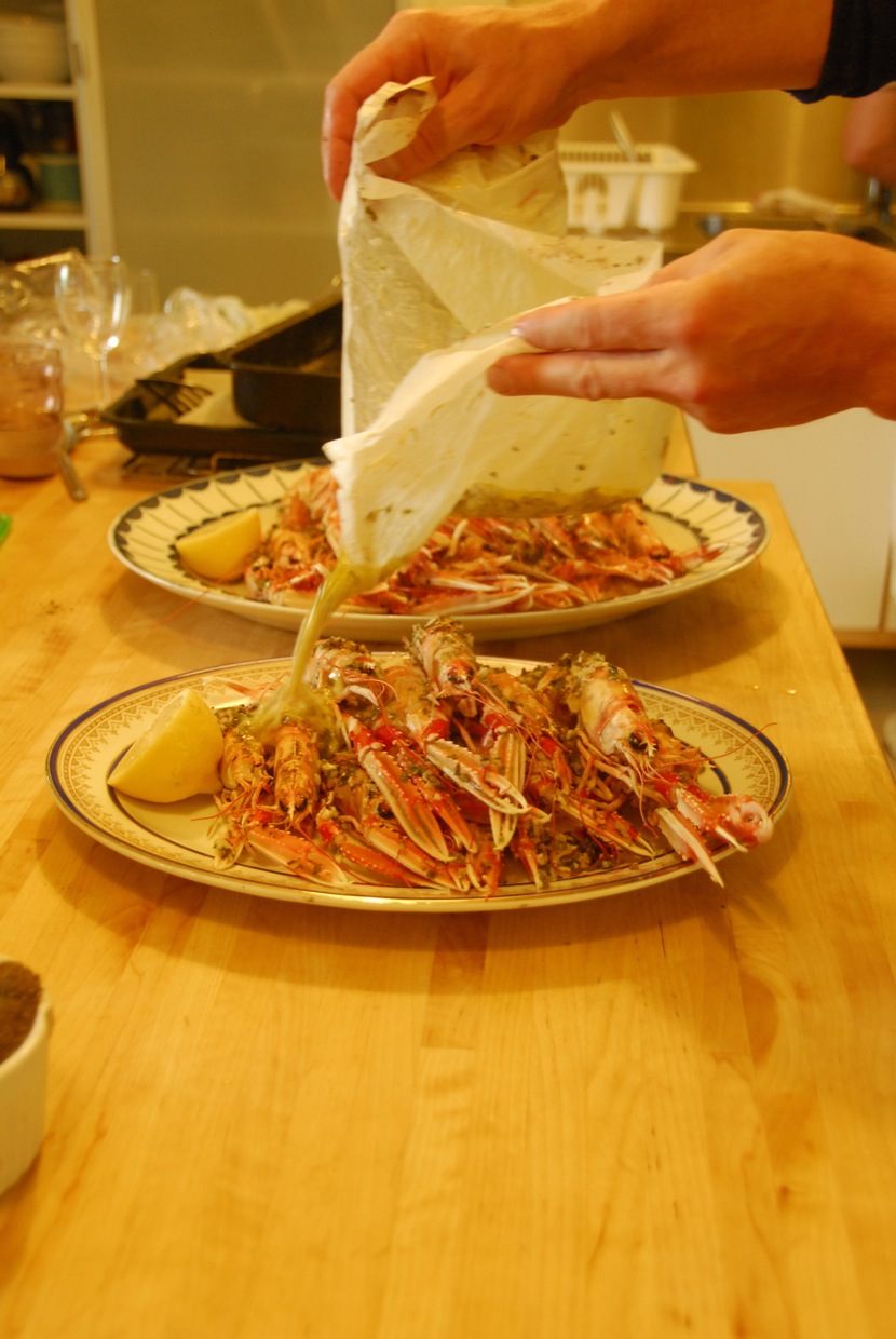 Sunday night dinner Adam ‘put the prawns/langoustine to sleep’, cut the backs of the shells off and dressed them with sage leaves, butter, pepper and a little salt. Put them in the oven, watched them then after a few minutes took them out. The aroma was fantastic.
