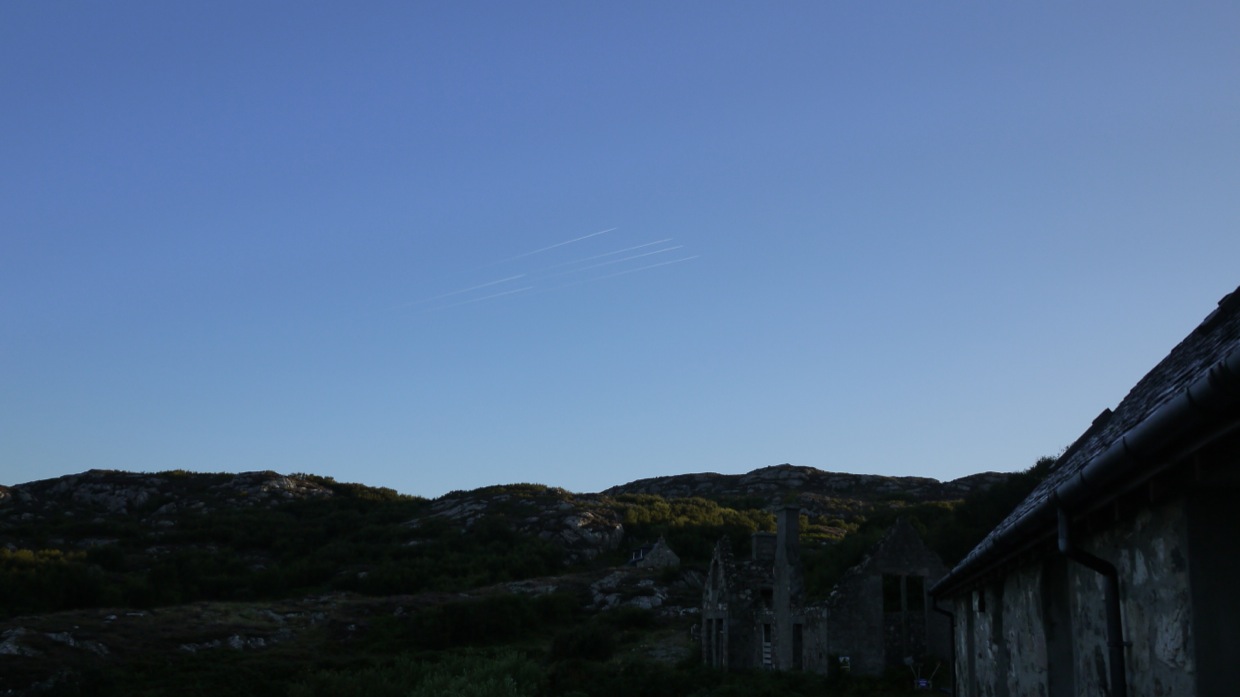 Next morning was serious stalking and i headed over to the cottages early, only to find Peter holding his arm. It had seized up overnight, an old injury had become inflamed. He was out of the game so I decided to go myself, just as we were talking these 5 military jets flew over, high in the sky.