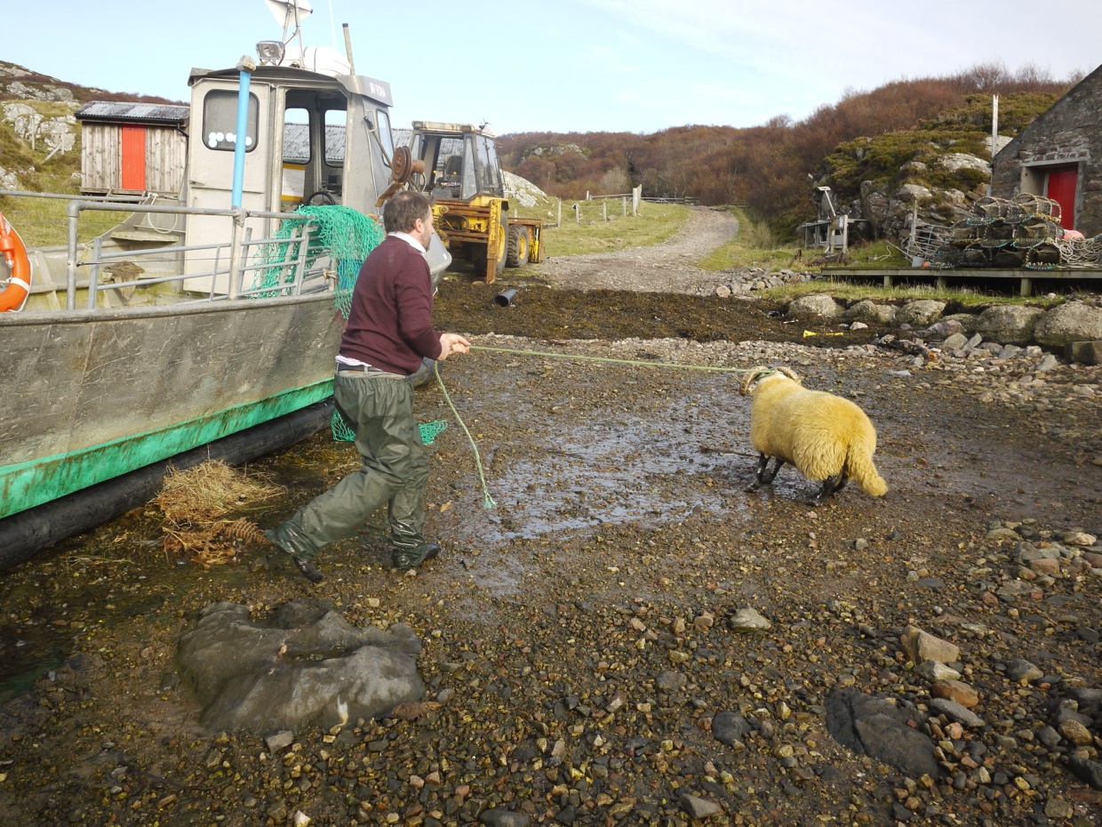 We got all that out of the way and then had to organise a delivery of sheep, 6 ewes and a tup from Richard at Kilmuir to Rona. Tuesday morning was bright and no breeze so it looked like a good day for working at the sheep. First thing I got a shout from L, there was a lamb stuck right behind the house. I have never seen a lamb so stuck and if this had happened elsewhere goodness knows when we would have found it. After much cutting and cursing I got it out. But to-day (Thursday) I see it is trailing a new piece of bramble!!