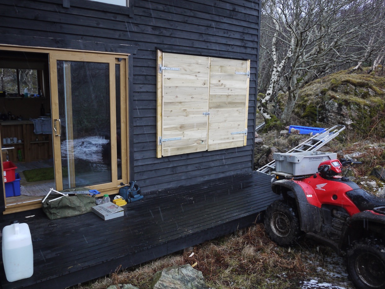 After all that I had numerous jobs to catch up on, one thing for sure you never get bored out here. The shutters for the cabin had been hanging around for weeks waiting for the hinges to come so that was the first job of the day, Thursday.