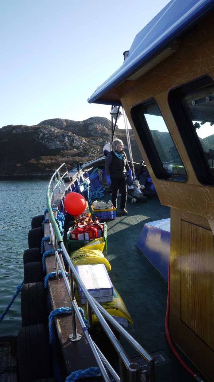 He was surrounded by his girls on the grass in front of the house, there is not much feeding for them so they hang about looking for sheep feed, any chance and they are in the shed raiding the bags. We had the boat coming at 12.30, with mail, rubbish, empty fuel cans and recycling to get together there was no time to ‘observe’ the sheep so head down and we got going. The morning passed very quickly and MV Aspire soon came into view.