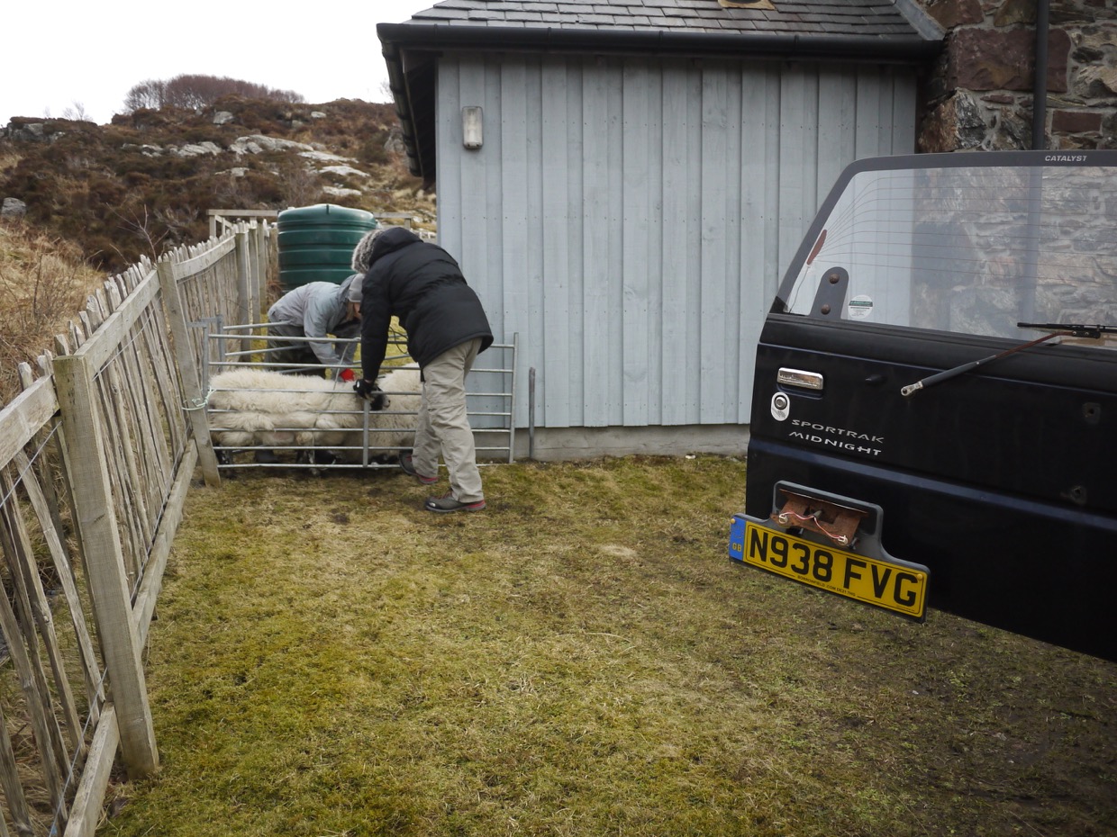 10 minutes later with a little help from Derick they were in the jeep trying to smash through the glass. So I had to quickly tie their feet, I never thought about the windows!! The sheep would not know what a window was of course. The only damage was the window clips, they both got bent but the glass stayed whole.