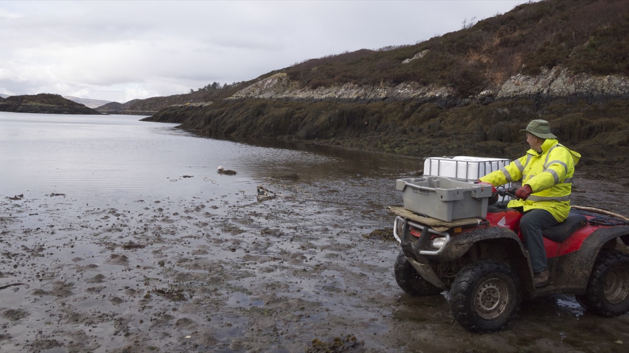 The first job for Calum was to help lift the IBC that had been blown off the pontoon in the winter storms out onto the shore (at low tide) for the pick up after the flood.