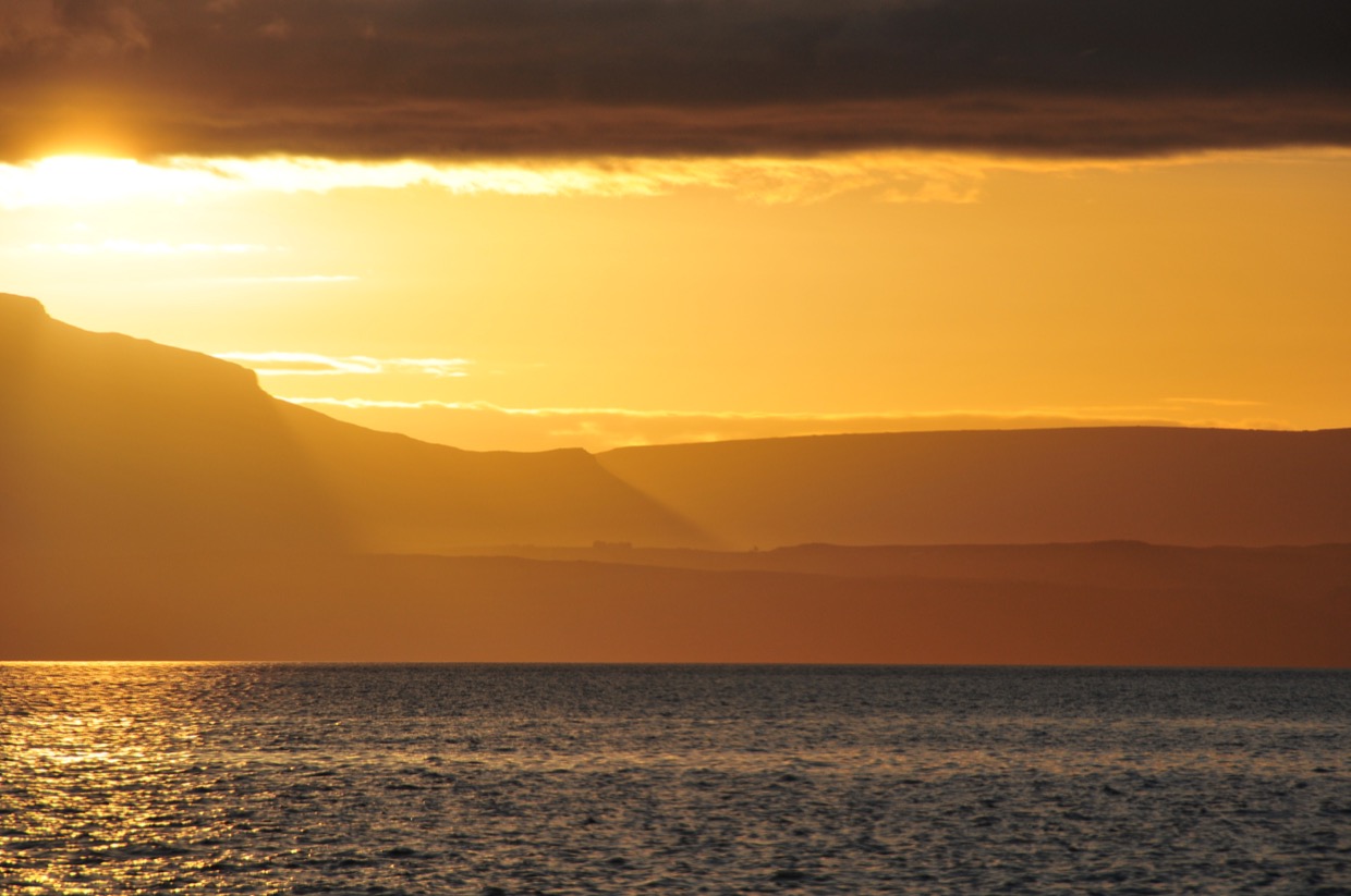 There was a length of fish farm feed pipe on the shore just inside Big Harbour and it has caused problems before so we decided to lift that and pull it back to the beach in front of the bothy for pick up in the morning. The sunset was stunning and it had been a very enjoyable sail.