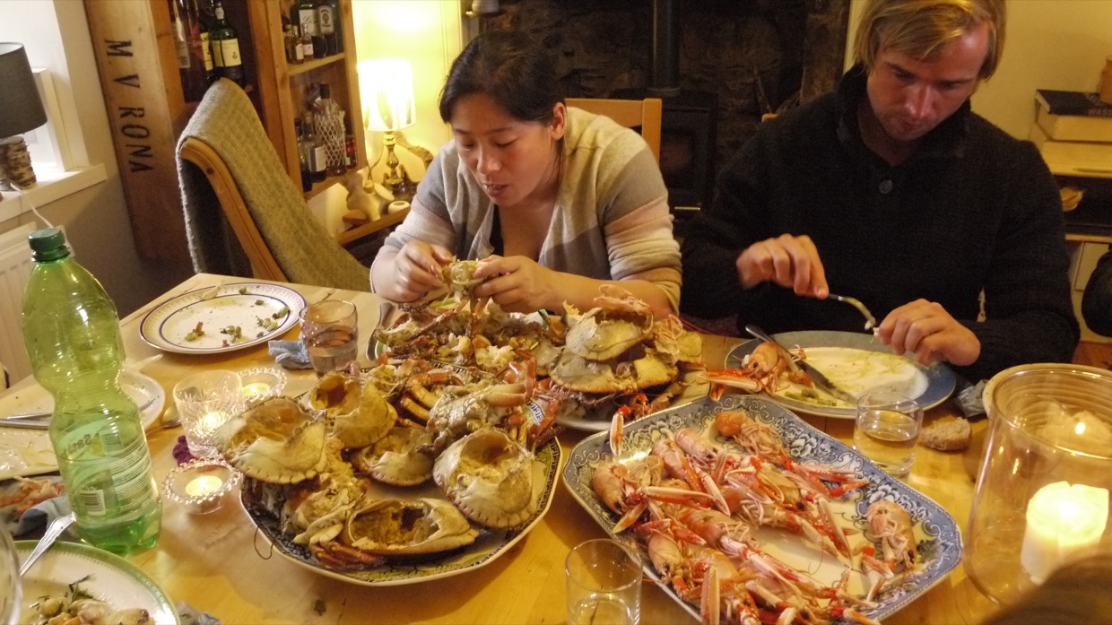 Back to Base and the cooking began, with lots of crabs to cook and prawns it was very hot for a while in the kitchen, Yang, Mathias’ partner got stuck into the body of the crabs but we were very quickly swamped by the Midge. Once peeled open and cracked Yang got stuck in to the feast.