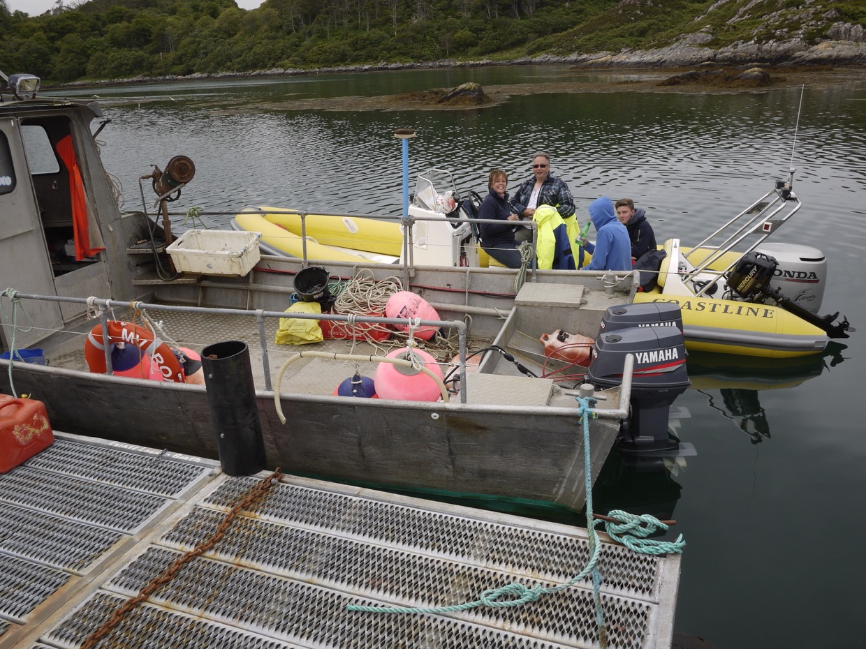 I got Claire sorted out with a promise to touch base at 9pm, then went fishing and returned to Big Harbour at 12ish. Kenny from Shieldaig had appeared on the horizon and he had bait for me so I headed in to the pontoon to see them. I was sorting out the catch and chatting to Kenny when this RIB with four on board arrived, for all the world like the Customs and Excise, but it was just the four florescent jackets they were wearing that threw me, not that I had anything to hide!!!!!!!!!