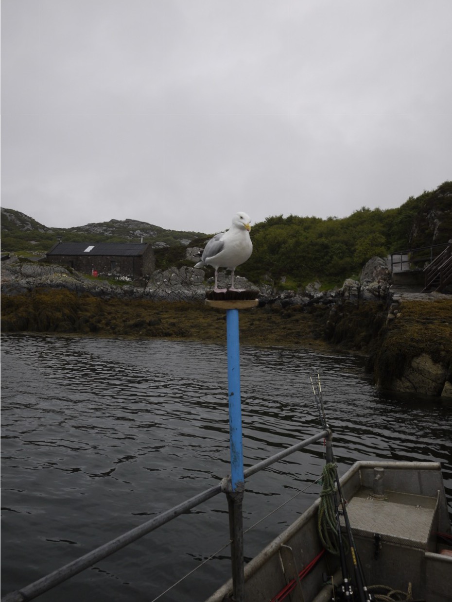 We visited Castaway Claire and got her news, then had two hours lifting creels, rod fishing and looking for the missing whales and dolphins. We did quite well, plenty Coleys but no Pollock (or whales). With some squatties and crab we headed in, sorted the catch under the watchful eye of my new pal, the hungry seagull.