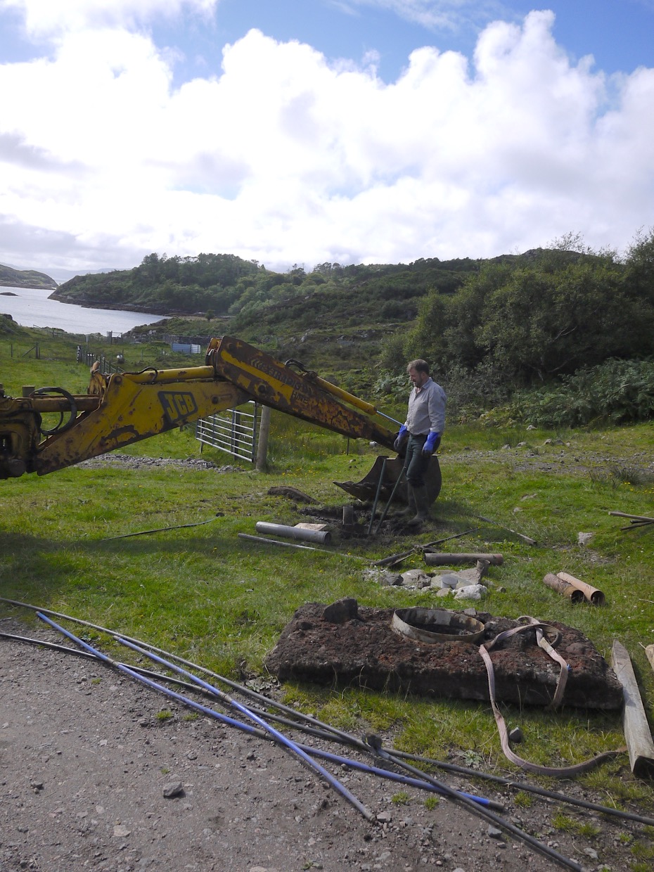 After much dodging between the showers and roding, poking and swearing, there was nothing for it but to open it up. With Hugh on the end of the phone I got my head round what was happening and started digging around. Finally after having to lift the manhole, concrete and pipes out (because I could not get into the manhole) I found the blockage and after a bit of serious poking, got the intake clear. All of a sudden we were working again and I had a sigh of relief. It is one of the major worries the septic tank but after 20 years of use it just keeps working despite the odd blockage. Now to put it all back together.
