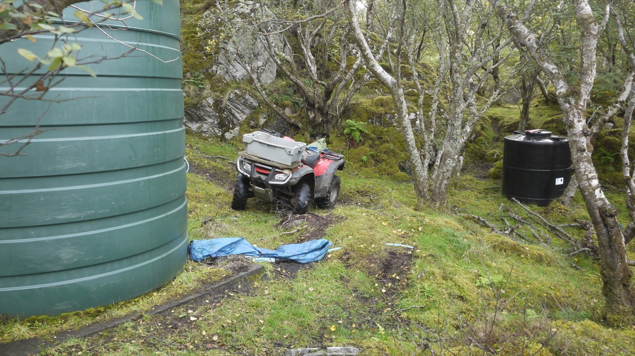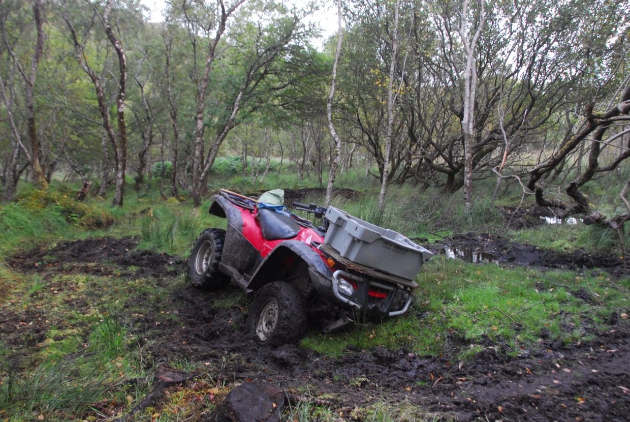 Got up this morning there is a stag by the shore with about 8 hinds and calves, very fine fellow and in tip top condition. It is 6.30am so I thought, I’ll go out for a look/spy. I saw a few deer up the track then headed North. Twenty yards into the forest in an effort to avoid the cottages so early in the morning and I went right into the axles on the old track, completely stuck, damn. I went for a walk then an even longer walk home, got the winch, the other ATV, got the bike out and then had breakfast at 10.00am.