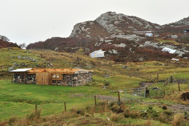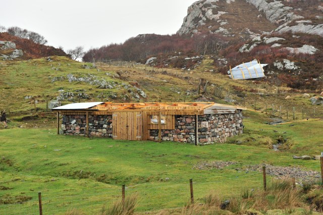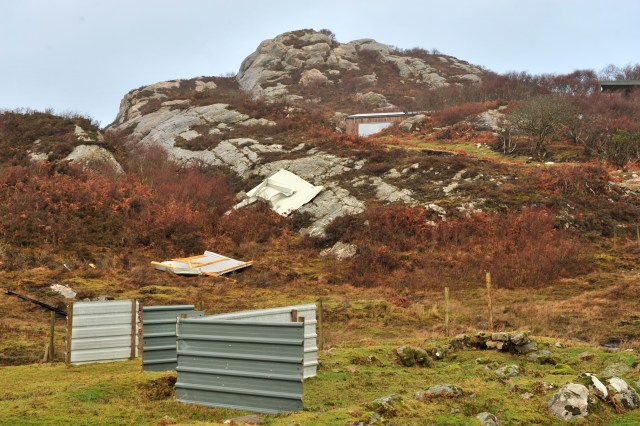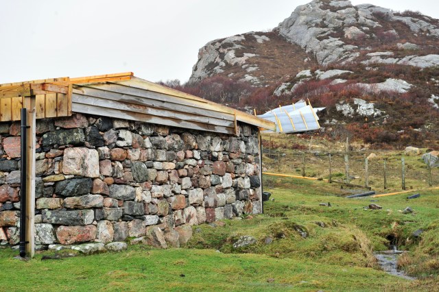 Well it is the first big one of this year, all the more scary because we did not have one last year in the New House. Yes, certainly very strong winds and gales but nothing like this. So it was a new experience all day Tuesday and night. Sitting ‘trying’ to watch Tv the entertainment really was watching the windows bending in and out with each gust that hit us. The house was relatively quiet, the wind was howling. Around 8.30pm I heard ‘something’. In the past that would say to me, you will need to go and look around tomorrow because ‘something’ has happened. That ‘something’ was the wood store and sheep shed down at the shore. A low lying almost flat roofed ruin we had renovated over years and roofed in 2016. So it had already stood up to some serious wind so it was a surprise on Wednesday morning to see the roof gone, at first I could not see the debris but then it appeared about 60 to 80 yards away in line with the new house in the hollows. Thankfully it did not get here but it is a sobering thought to think that it could have hit the house.