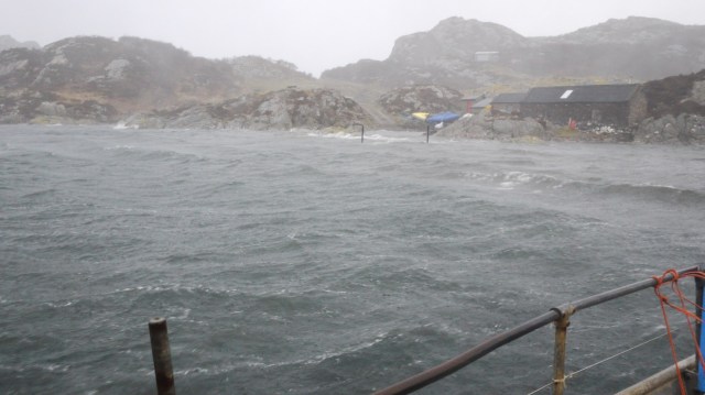 With Calum here and the season just about on us we had to put the Mooring tackle back in the water, no sense in it wearing away overwinter so we store it ashore. It was a very poor day when I went to the boat, which was ashore to check if I could get it in on the tide. It was an exceptionally high tide that morning, I found the waves were breaking over the stern of the boat and swamping the engines. I had to act fast, I could not pull it forward with the JCB but with the high tide I could easily push it into the water but just as I did this the storm really got going. The next half hour was interesting to say the least!!!! Suffice to say Callum arrived at the pontoon just in time to take my ropes. An hour later it was calm enough to put in the moorings, funny weather.