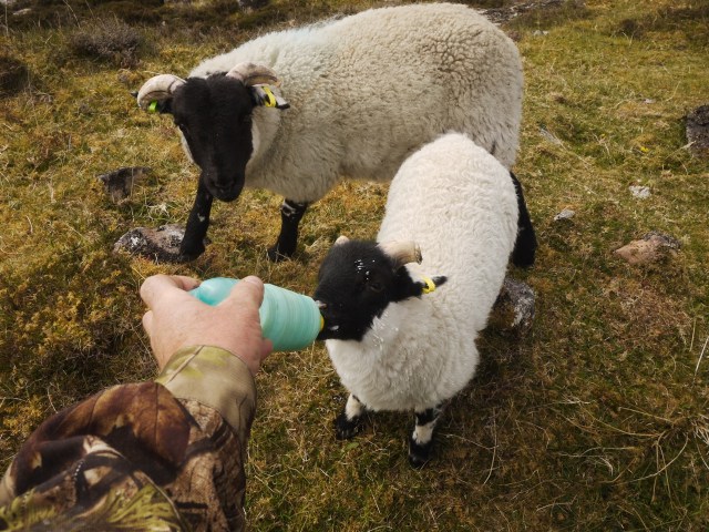 We have more pet lambs than ever this year, with no grass, cold weather and the most ewes lambing ever it has been full on, 20 or 200 you still have to get up and go round them first thing or the predators/cliffs/bogs will get them. I’ll save you the pictures of the remains of the two we lost to the Eagle (Sure it is a Golden rather than Sea!!), from this elevation you get a birds eye view of the Eagle passing the window just on darkness quartering the field/outrun. Thankfully he is finding food elsewhere (I hazard a guess at deer who have succumbed to the winter) and we have only lost two lambs. But with grass in short supply the Gimmers have given us problems. With a few cases of mastitis on the go this year too, it is no surprise to have to supplement the feeding and to have a twin lamb cast out. The smaller of the two above is a gimmer’s lamb where she was not able to feed it. We nearly lost the gimmer in February to the tick. She was so badly infested it was touch and go but she has survived and in April produced this small lamb, he is coming on, growing well.