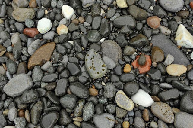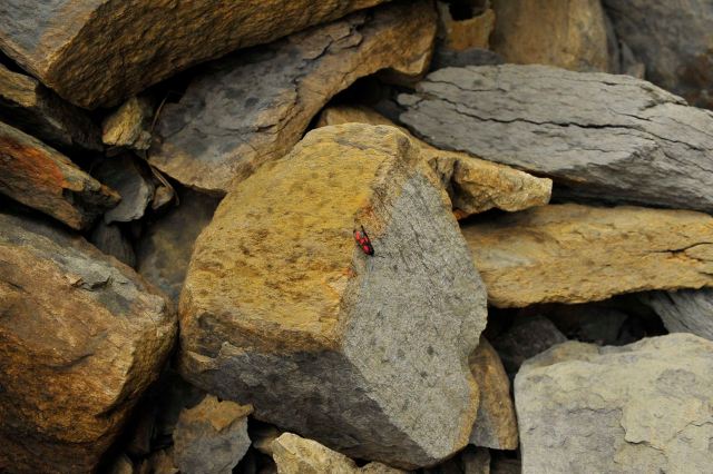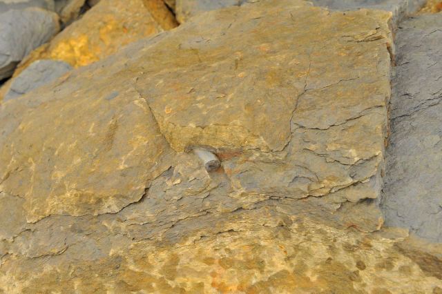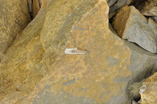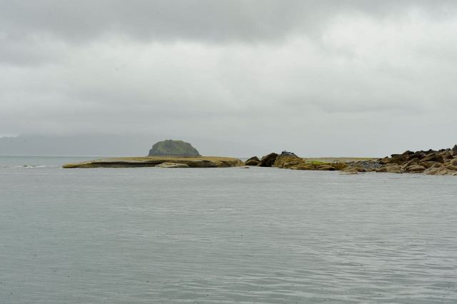 This cliff face had certainly changed since Calum’s last visit and with the rockfall we were able to see the signs of fossils in quite a few of the rocks. It is quite overwhelming to stand there and to take in just how old the geology here is.There were many Belemnites and a few Ammonites nice to see them and wonder. More time in the near future and the rain not soaking the camera and there could have been some interesting finds. Next calm day!!!!If my camera has survived to-day’s soaking.The landing at Rigg was as Calum predicted, a natural pier. I have some friends coming from this area and had a thought to zip over and pick them up there. A wee scramble over the rocks and we will be good to go. A good Recce. A surprise when concentrating on finding fossils to see a ‘Burnet Moth’, on the shore resting on a rock, we see them on Rona occasionally but not for a long time. The red spots stuck out on a grey morning, lovely to see but am thinking the weather was not so good for it. The beach stones were also fascinating, we do not have many round stone beaches on Rona and certainly not any as interesting and colourful as this. Again if we had more time it would have been nice to stay. As it happened before we could go any further the rain really came on and with a very wet camera it was time to pull out. We had a big pod of Dolphins on the way home always a pleasure to see not so sure about the newfishfarm (camera and phone now too wet for a picture) off Rigg. I wonder how it will get on during the Northerly storms, although there were many anchors and rope about!Which reminds me that on arriving at Beareraig the first thing we saw was a fresh salmon jumping out of the water, the second a Sea Eagle with what we thought an Oystercatchers chick but it may have been a fish, whatever, it was a kill. Ten minutes later the Male Sea Eagle flew out from the shore in front of us. All in all a great trip out on a wet Sunday  morning.