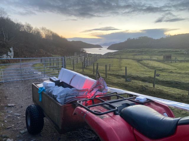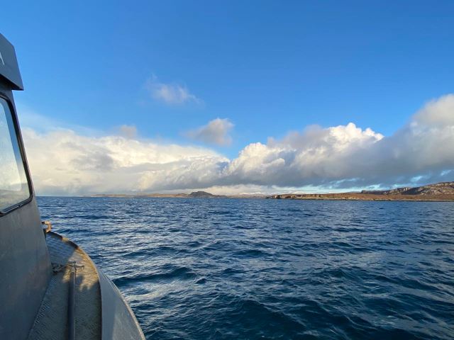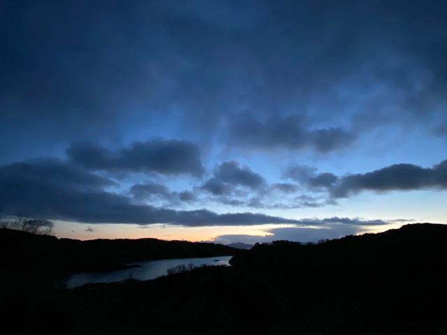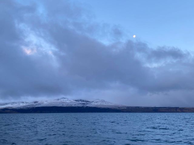 Venison orders are coming in for Christmas, we have a few regulars and with the current situation with Covid the only thing to do is to butcher all our deer and sell them locally. We usually put away half to the Game Dealer. So it was good to get a couple of orders for Portree to-day. Fed the sheep and ewe lambs, then gathered up the rubbish, fuel tanks and empty gas cylinders, then time for the boat.Got the boat in to the pontoon, in the dark then loaded it up and then back to the house to pick up the mail.Of around 8ish, the wind dropped off completely just about then, there was a bit of a jabble left but it was fine, wind dropping. It was cloudy but clearing, the promise of a good day.The joys of Portree, dump the re-cycling, pick up gas for Fladda, then fuel up after picking up the post, lots of post. Heading for 10.30am by this time. Back to the boat to load up, shift the boat the tide was dropping then fuel up for the return journey. Back to the filling station to fuel up the empty can, then down to the Bank.Met up with friends from Shieldaig for a quick coffee which became expensive after the local traffic warden left a wee yellow envelope on my windscreen. The parking place where I always park is now a Taxi rank, great!! Where’s the sign? Oh! under the slush on the road.Did the shopping, then all the other bits and pieces, the kids were out from school so it must have been 1’ish. Parked the car and then off to Fladda to drop the gas off.Passed James trawling home I guess.Turned into Loch a Sgurr, then into North Harbour at Fladda.Of course the tide was perfect!! But we have a system for unloading, so half an hour with John and Erlet who are enjoying a late stay on Fladda then off home.It was starting to get dark but there was no wind just a clear cool late afternoon leaving North Harbour.Some special clouds to-day, lots of weather out there.Lorraine was waiting to help unload the boat, the tide perfect again!! Lots of stuff and I wondered as I was taking the last box up. How many times in 18 years have I been up and down this gangway.Boat back on the mooring, the forecast is grim.