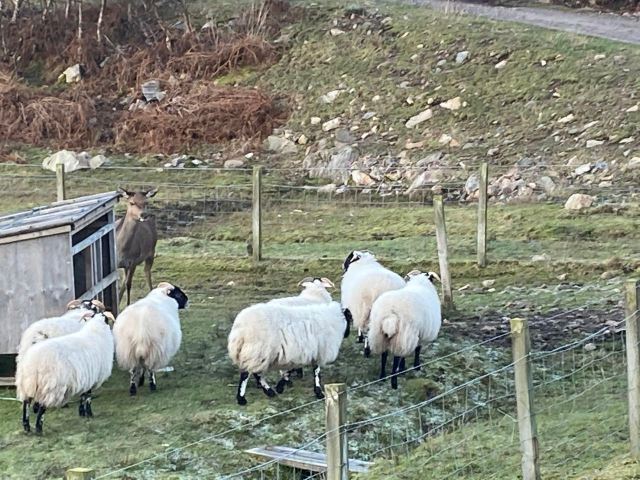 Julie was our semi tame hind, now deceased and it is obvious that she had taught her daughter very well on where to find the sheep nuts.