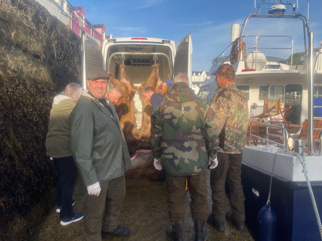 Our Danish stalking guests come every two years and love the visit to Rona. They always have a good week with much walking, talking, drinking and eating. They have been coming for several years now and enjoy the Island life for one week. We have to cull a set number of deer each year which we decide on in the spring after our deer count. Although most of our deer go towards the venison that we sell we do have to cull the remainder in October. It provides an income and we can deal with the numbers in one week. The carcasses go off to the Game Dealer (I cannot handle 7 at once).