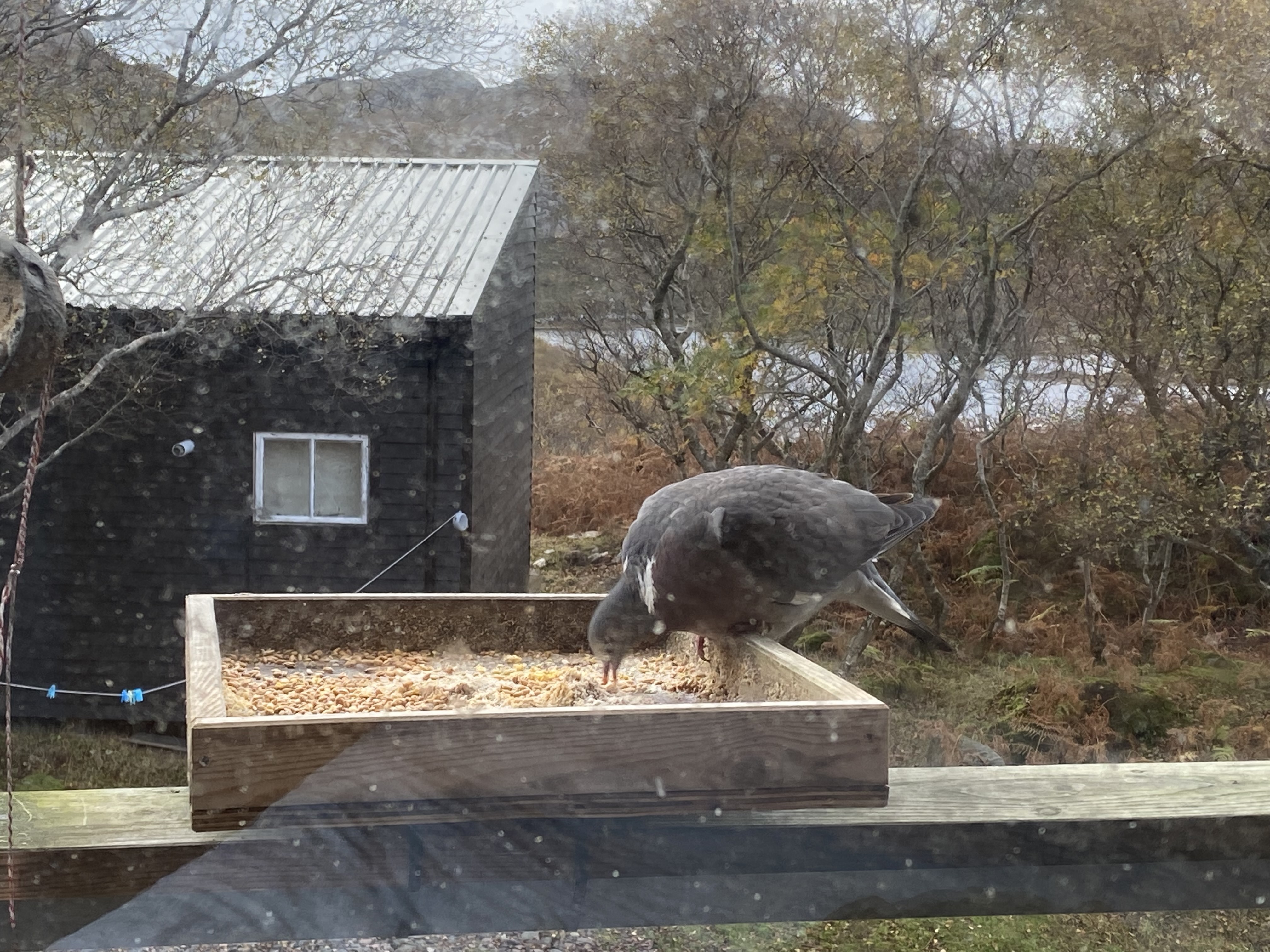 Finally for October in this last week we have had a new visitor linger about on Rona. This woodpigeon arrived and has decided the food supply is to its liking. The chaffinches are not happy and hang about protesting when he hoovers up their breakfast. Amazing how the woodpigeon found the bird table so quickly.