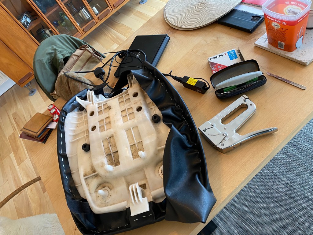 We bought a new bike and thankfully did not need it during the stalking week, it was good to have it in the garage and it will be pressed into service soon when the old one comes in for major works. In the meantime I upholstered the cut seat from the old bike, no more wet bums!!