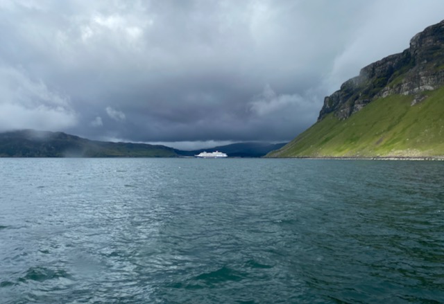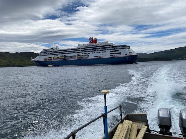 As I approached Portree Thursday I could see yet another liner anchored off, the picture is a bit fuzzy, must be the rain on the window? But it was the black clouds coming that bothered me rather than the chaos that comes with these visits , on the pier. Fingers crossed the weather would not get too blustery for the way back.