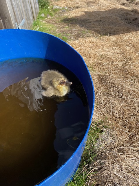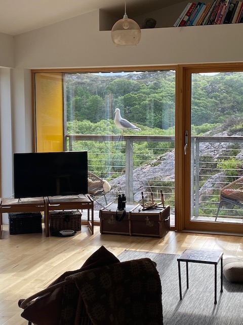 The heat is upsetting the birds. There are nests everywhere and the Greylags are doing well. With no horses this year and dogs chasing the goslings perhaps they will fare better. They are a pest elsewhere but not a problem for us. In fact this wee fellow was exhausted and dehydrated so I put him on the water and he recovered, although I do not know for how long. Pesky our visiting seagull patrols the house, looking inside, from balcony to balcony. He will be soon gone (we hope).